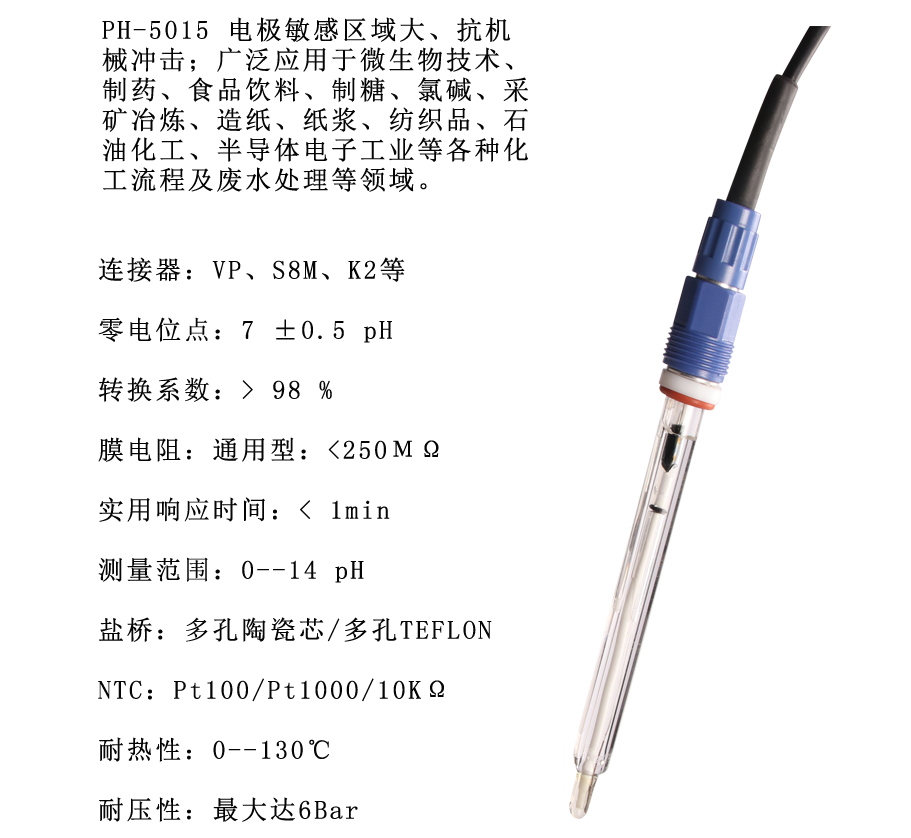 PH-5015电极敏感区域大、抗机械冲击;广泛应用于微生物技术、制药、食品饮料、制糖、氯碱、采矿冶炼、造纸、纸浆、纺织品、石油化工、半导体电子工业等各种化工流程及废水处理等领域。