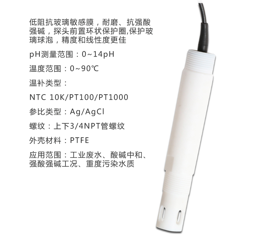 低阻抗玻璃敏感膜,耐磨、抗强酸强碱,探头前置环状保护圈,保护玻璃球泡,精度和线度更佳