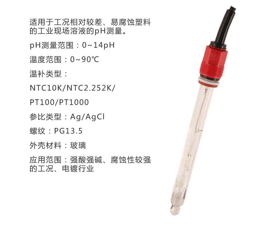 低阻抗玻璃敏感膜,耐磨、抗强酸强碱,探头前置环状保护圈,保护玻璃球泡,精度和线度更佳